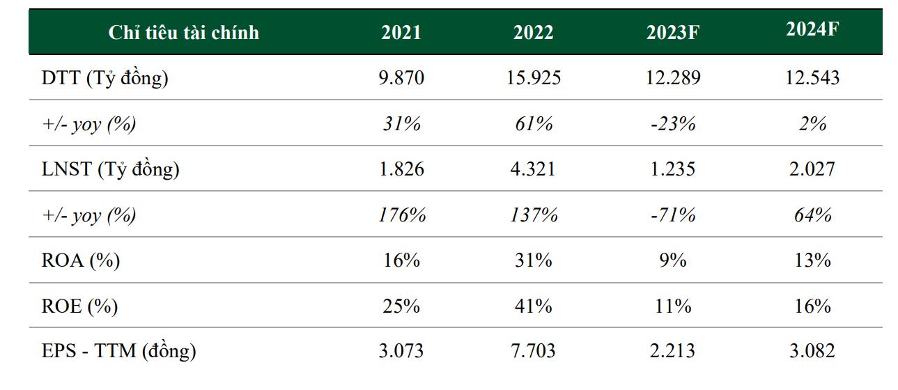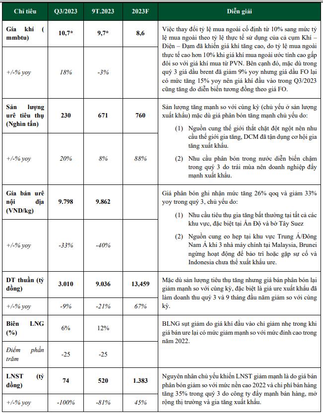 Cho năm 2023, chúng tôi đưa dự phóng dựa trên giả định giá urê cho năm 2023 ở mức 430 USD/tấn, giá dầu Brent 84 USD/thùng. Ứớc tính DT đạt 12.289 tỷ đồng (-23% yoy), LNST năm 2023F đạt 1.235 tỷ đồng (-71% yoy).