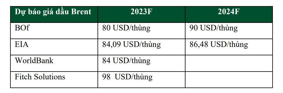 Giá dầu FO kỳ vọng biến động tương quan với giá dầu Brent được dự báo bởi EIA. EIA dự báo dầu Brent giao ngay trung bình năm 2023 và 2024 lần lượt là 84,09 USD/thùng (-18% yoy) và 86,48 USD/thùng (+3% yoy).