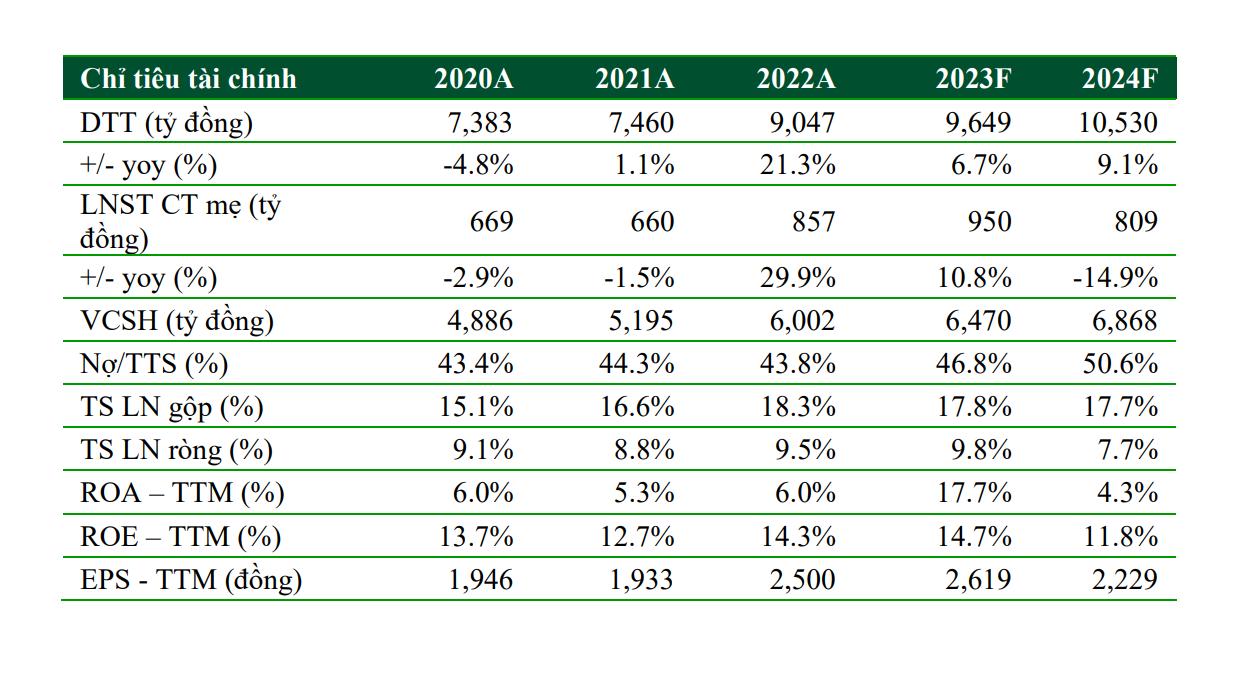 Cho 2023-2024: dự phóng DTT đạt lần lượt là 9.641 tỷ đồng (+6,6% yoy) và 10.513 tỷ đồng (9,0% yoy), LNST CT mẹ 2023-2024 đạt 950 tỷ đồng (+10,8% yoy) và 809 tỷ đồng (-14,9% yoy).