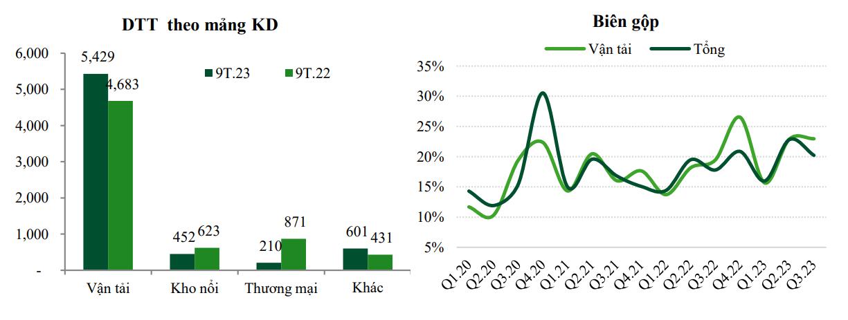 Lũy kế 9T DTT mảng vận tải tăng trưởng 15,9% yoy đạt 5.429 tỷ đồng, màng kho nổi và thương mại giảm mạnh 27,5% và 75,9% yoy. Biên gộp vận tải tương ứng mức cùng kỳ năm ngoái đạt 20,2% (9T.22: