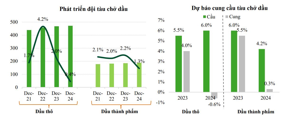 Cung: Do lượng đơn đặt hàng tàu mới ít nên việc giao tàu mới không đáng kể. (1) Đội tàu chở dầu thô được dự báo tăng trưởng 0,4% trong 2024 (2% trong 2023); (2) đội tàu chở dầu thành phẩm ước tính tăng 1,4% trong 2024, lượng đặt trong 2023 tăng nhưng đến 2025 mới giao tàu.