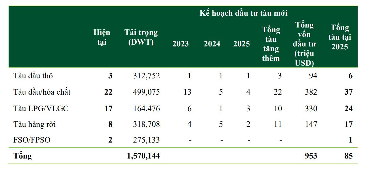 Theo kế hoạch đến 2025 PVT sẽ đầu tư thêm 46 tàu từ 2023-2025 tổng vốn đầu tư là 953 triệu USD. (tăng năng lực vận tải tăng gấp đôi từ 1,3 triệu DWT lên 2,5 triệu DWT)